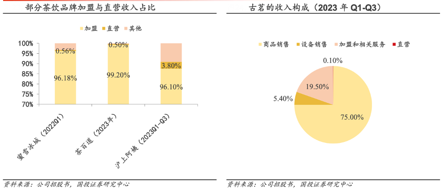 經典案例:根據公司招股書、國投證券研究中心等綜合資訊表明,從加盟和直營收入角度,我們可以看到蜜雪冰城、茶百道和滬上阿姨的加盟收入占比均已超過了96%,加盟收入在主營業務收入中占據絕對主導地位。加盟模式下絕大部分收入來自于向加盟門店銷售商品及設備,古茗 2023 年前三個季度中商品和設備銷售以及加盟和相關服務的收入占比達到了 99.9%。