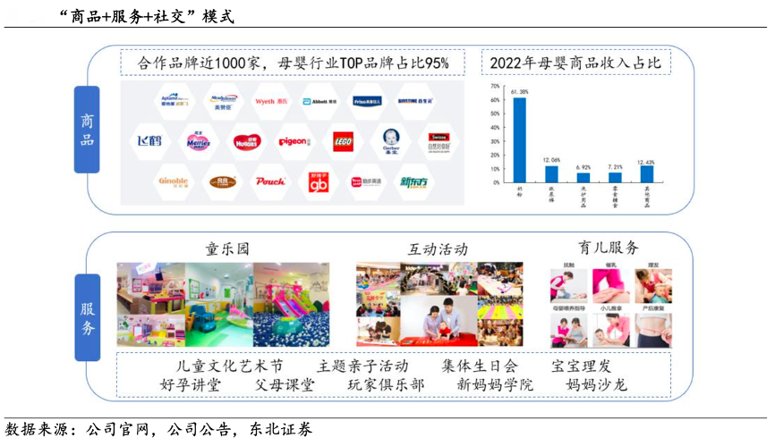 經典案例:根據公司官網、公司公告、東北證券等綜合資訊表明,相對于其他線上平臺,孩子王平臺精準對焦母嬰群體,縮短商戶與目標客群的接觸距離,提高商戶的廣告投入產出效果,入駐商家有望逐漸提升。C端方面,主要開展涵蓋童樂園、互動活動和育兒服務的母嬰服務,豐富的社交活動將不斷吸引更多母嬰客戶加入。
