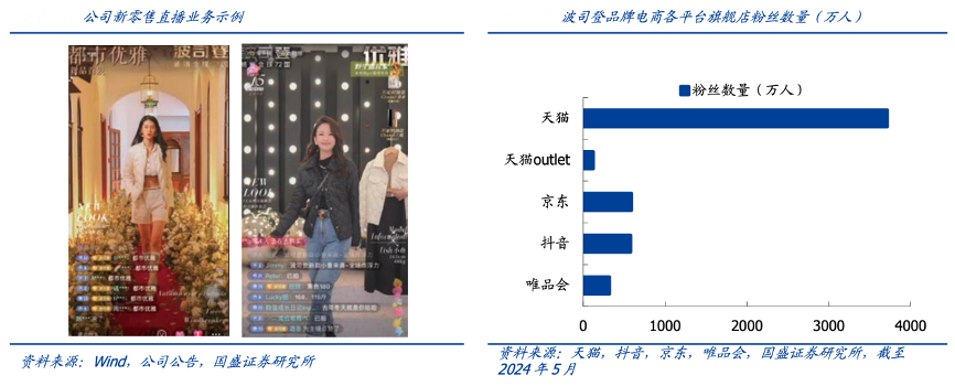 經典案例:根據wind、公司公告、天貓、抖音、京東、唯品會、國盛證券研究所等綜合資訊表明,目前波司登公司電商已經形成全面的平臺布局:天貓、京東、唯品會、抖音等多平臺全 面覆蓋,傳統電商、直播電商多點開花。據各平臺數據,截至 2024 年 5 月主品牌 波司登在天貓/京東/抖音/唯品會平臺旗艦店鋪粉絲數量分別為 3714/588/577/318 萬人,過去持續增長。