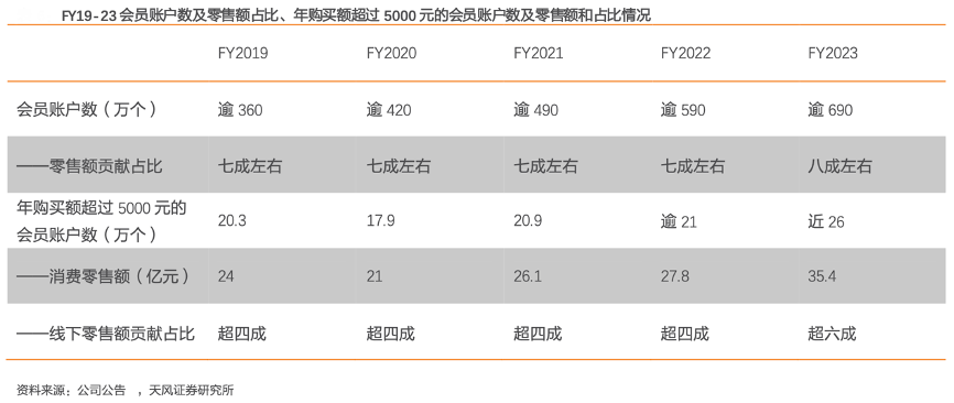 經(jīng)典案例:根據(jù)公司公告、天風(fēng)證券研究所等綜合資訊表明,江南布衣精心設(shè)計(jì)的會(huì)員制度提升了消費(fèi)者體驗(yàn),為品牌提供深入的市場(chǎng)洞察。FY19-23,公司會(huì)員賬戶數(shù)由逾 360 萬(wàn)個(gè) 增長(zhǎng)到逾 690 萬(wàn)個(gè),零售額貢獻(xiàn)占比增長(zhǎng)至八成左右;年購(gòu)買(mǎi)額超過(guò) 5000 元的會(huì)員賬戶 數(shù)由 20.3 萬(wàn)個(gè)增長(zhǎng)到近 26 萬(wàn)個(gè),這部分客戶的消費(fèi)零售額由 24 億元增長(zhǎng)至 35.4 億元 (CAGR10.2%),線下零售額貢獻(xiàn)占比超過(guò)六成。
