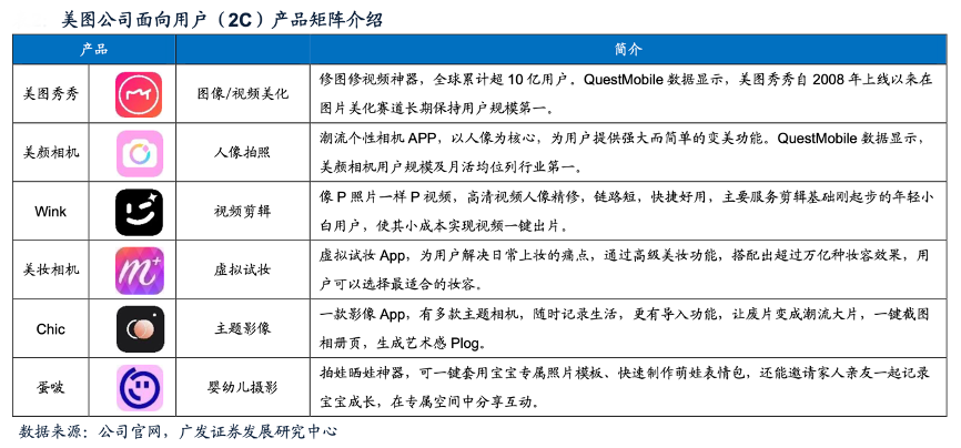 經典案例:根據(jù)公司官網、廣發(fā)證券發(fā)展研究中心等綜合資訊表明,美圖公司C端產品主要包括美圖秀秀、美顏相機、Wink等,覆蓋拍照攝影美化、虛擬試妝、寶寶相機、視頻剪輯等多個細分場景。通過定制化“美圖配方”、AR效果、馬賽克、趣味貼紙等新穎有趣的互動模式和強大的內容生態(tài),滿足了用戶多元化的影像處理需求。