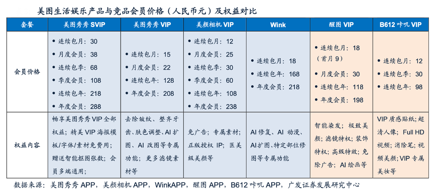 經典案例:根據(jù)美圖秀秀APP、美顏相機APP、winkapp、醒圖APP、B612咔嘰APP、廣發(fā)證券發(fā)展研究中心等綜合資訊表明,美圖秀秀和 美顏相機為用戶提供了免費基礎版和會員模式,在產品定價方面,排除美圖秀秀的SVIP,美顏相機和B612咔嘰相對便宜,醒圖和Wink價格 相對較高。