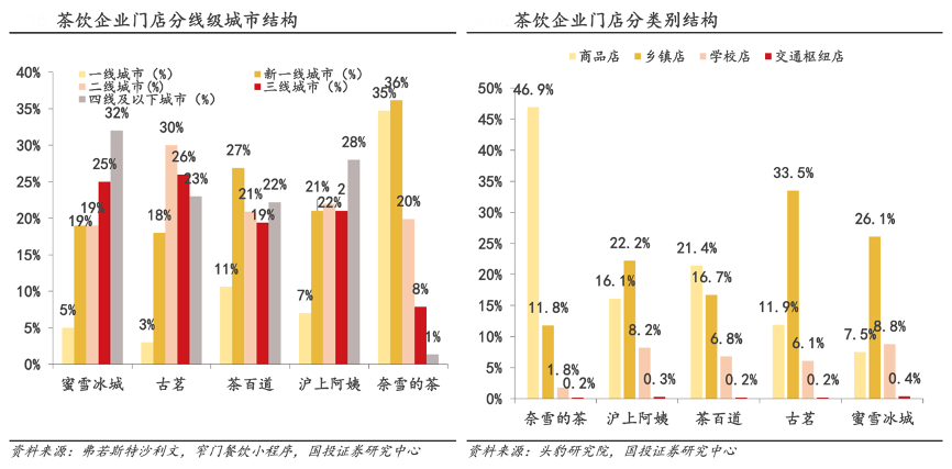經典案例:根據弗若斯特沙利文、窄門餐飲小程序、頭豹研究院、國投證券研究中心等綜合資訊表明,從門店城市分布結構看,奈雪的茶主要門店集中在一線、新一線城市,對應其高端品牌定位;而古茗和蜜雪冰城則相對集中在三線,四線及以下城市,對應其低線級向高線級城市的發展戰略。從門店區域分布結構看,奈雪的茶主要門店集中在商圈,而古茗和蜜雪冰城則相對集中在鄉鎮店。
