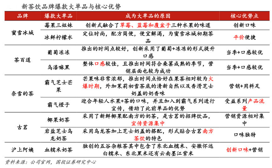 經典案例:根據公司官網、國投證券研究中心等綜合資訊表明,新品浪潮迭代,爆款大單品銷量穩定,蜜雪冰城推出的冰鮮檸檬水以其平價便捷口感使得其成為爆款商品風靡全國,茶百道抓住茶飲融合桑葚契機,以爽口的口感與較好的營銷使其快速成為代表性大單品。
