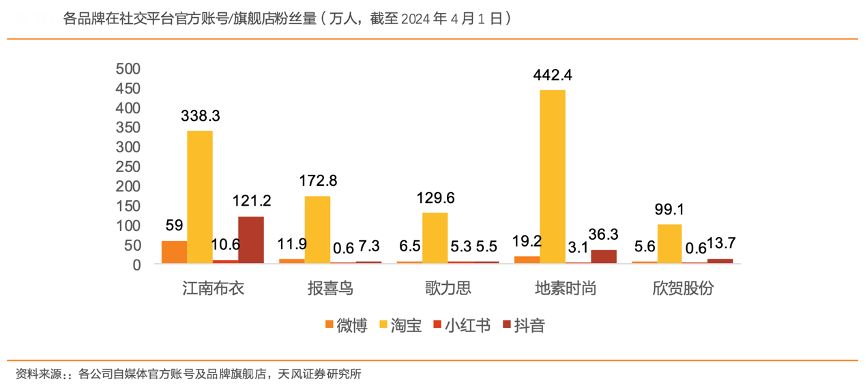 經典案例:根據各公司自媒體官方帳號及品牌旗艦店、天風證券研究所等綜合資訊表明,江南布衣公司持續優化以粉絲為核心的全域零售網絡的建設,公司 各大社交平臺官方賬號和旗艦店粉絲數都在同業企業中位居前茅。截至 2024 年上半年財年,江南布衣在各大社 交平臺上的粉絲量累計超過 850 萬。