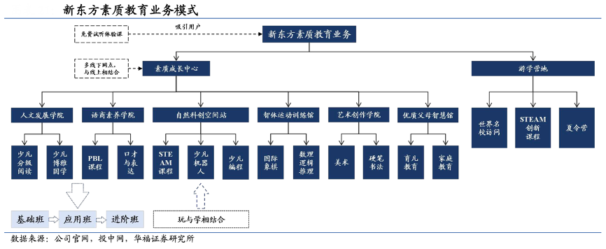 經(jīng)典案例:根據(jù)公司官網(wǎng)、投中網(wǎng)、華福證券研究會(huì)等綜合資訊表明,新東方素質(zhì)教育的業(yè)務(wù)分為素質(zhì)成長(zhǎng)中心和游學(xué)營(yíng)地兩大板塊,提供豐富多樣的教學(xué) 內(nèi)容,創(chuàng)新教育模式,旨在培養(yǎng)孩子的多元化能力。其中的素質(zhì)成長(zhǎng)中心結(jié)合線上線下 模式,通過免費(fèi)試聽課程吸引顧客,包括人文發(fā)展學(xué)院、語(yǔ)商素質(zhì)學(xué)院、自然科創(chuàng)空間站、智體運(yùn)動(dòng)訓(xùn)練館、藝術(shù)創(chuàng)作學(xué)院和優(yōu)質(zhì)父母智慧館六大領(lǐng)域。