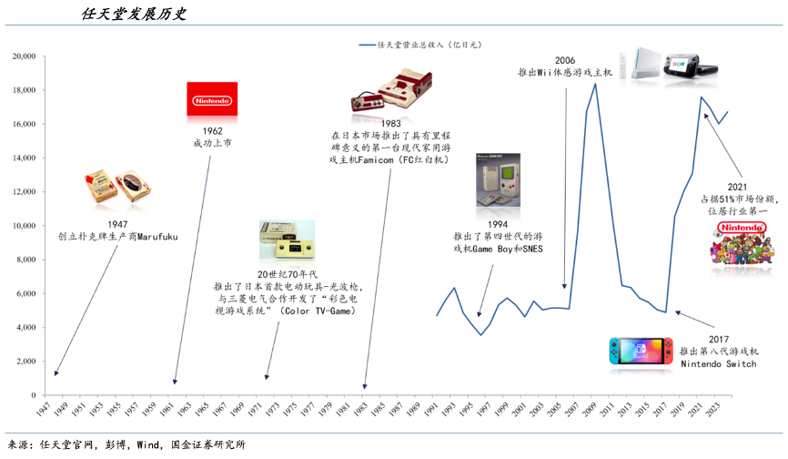 經典案例:根據任天堂官網、國金證券研究所等綜合資訊表明,任天堂公司是一家具有豐富歷史和全球影響力的游戲企業。最初作為一家撲克牌生產商,由山內房治郎在 1947 年 11 月創立,公司最初名為 Marufuku。隨著時間推移,任天堂經歷了商業模式的多次變革,并在 20 世紀 70 年代推出首款游戲機,標志著其正式進入電子游戲行業。