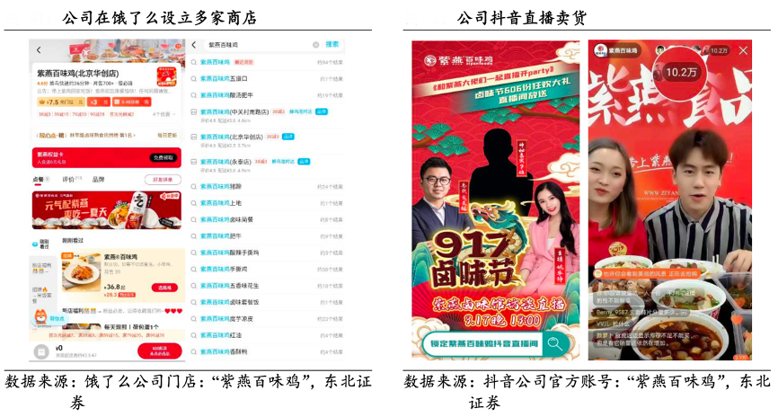 經(jīng)典案例:根據(jù)餓了么公司門店:“紫燕百味雞”、抖音公司官方帳號:“紫燕百味雞”、東北證券等綜合資訊表明,紫燕食品公司積極開辟外賣平臺、O2O 平臺的線上渠道。隨著外賣的普及化,公司也與美團(tuán)、 餓了么等外賣平臺達(dá)成合作,在平臺上開設(shè)線上門店,讓顧客無時無刻都能享有新鮮紫燕鹵制品。