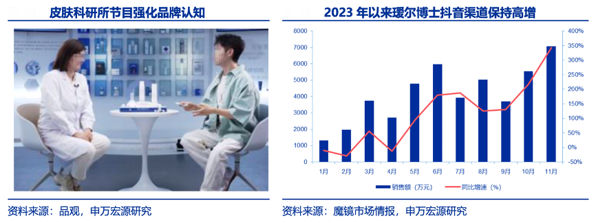 經典案例:根據品觀、魔鏡市場情報、申萬宏源研究等綜合資訊表明,在微生態護膚的心智搭建上,璦爾博士在《皮膚的真相》《專家請指教》 《皮膚科研所》系列短視頻中,邀請上海市皮膚病醫院專家鄒穎、重慶醫科大學附屬第一 醫院皮膚陳瑾教授、知名 KOL 楊若天、璦爾博士首席研發師李燕等專家、科研人員走到臺 前,直面消費者需求,實現營銷和科普的“跨界融合”。在專家+達人的 線上營銷體系下,自 2023 年下半年開始,璦爾博士抖音渠道銷售額連續保持三位數高速增 長。