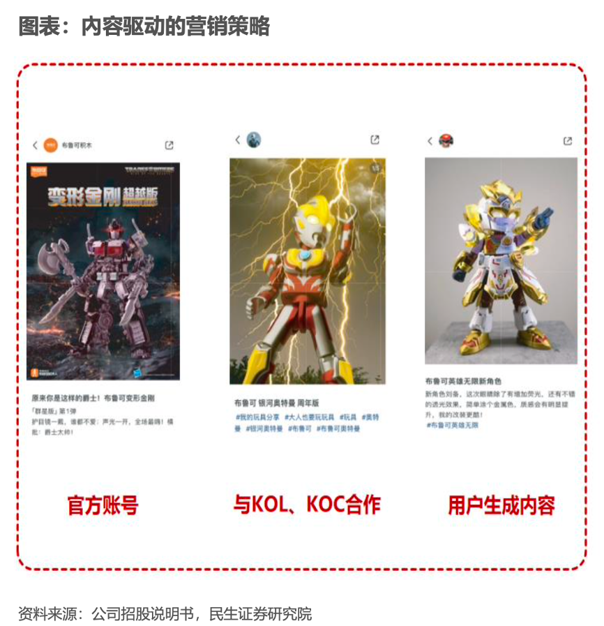 經典案例:根據公司招股說明書、民生證券研究院等綜合資訊表明,布魯可使用多重傳播渠道,如公司官方賬號及社交媒體平臺上的 KOL、KOC、粉絲及BFC賬號。玩具愛好者積極創作并分享視頻和帖子,這些內容在社交媒體平臺上獲得了數以百萬計的播放量。在2023及2024年內與布魯可合作的KOL 和KOC在2024年3月31日擁有全網粉絲數約1.60億。