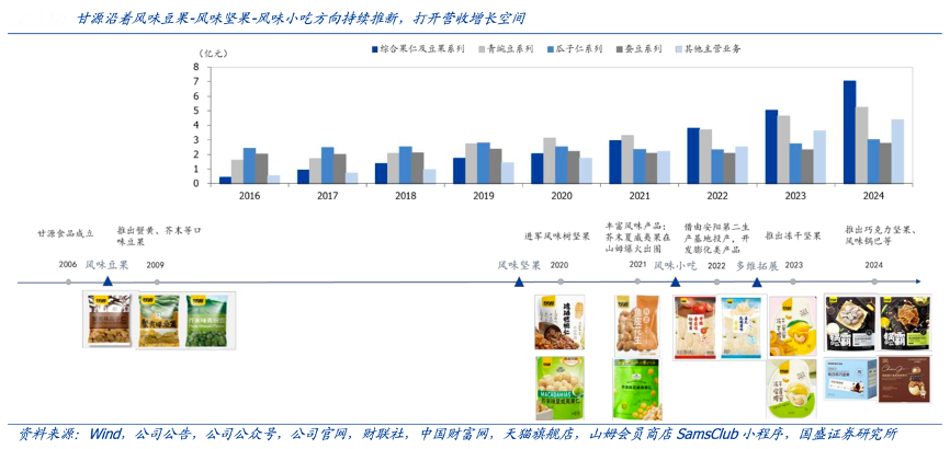經典案例:根據wind、公司公告、公司公眾號、公司官網、財聯社、中國財富網、天貓旗艦店、山姆會員商店SamsClub小程序、國盛證券研究所等綜合資訊表明,甘源以風味化創新為基礎,持續在風味領域深耕,除了產品體系的拓展、口味的不斷延展,更打造出多重生產工藝,構建風味研發壁壘。