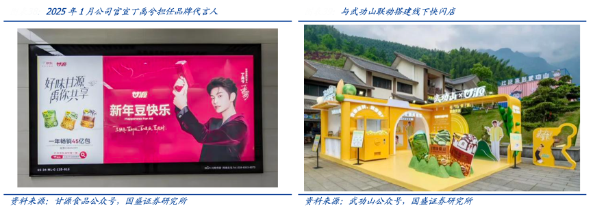 經(jīng)典案例:根據(jù)甘源食品公眾號(hào)、武功山公眾號(hào)、國(guó)盛證券研究所等綜合資訊表明,2025年1月甘源公司官宣丁禹兮擔(dān)任品牌代言人,春節(jié)期間定制代言人禮盒,搭配贈(zèng)送明星獨(dú)家周邊。同時(shí)開展一系列品宣活動(dòng),線下聯(lián)合老婆 大人打造定制陳列,組織主題門店打卡活動(dòng)。此外借助萍鄉(xiāng)旅游優(yōu)勢(shì),與武功山聯(lián)名搭建線下快閃店,打卡贈(zèng)送冰激凌,并沿線投放宣傳物料,實(shí)現(xiàn)吃喝玩樂巧妙互動(dòng)。