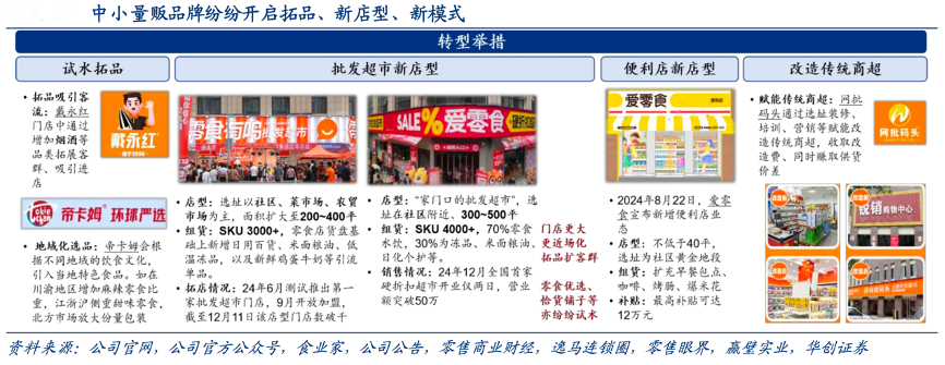 經典案例:根據公司官網、公司官方公眾號、食業家、公司公告、零售商業財經、逸馬連鎖圈、零售眼界、贏壁實業、華創證券等綜合資訊表明,中小量販品牌紛紛開啟拓品、新店型、新模式。