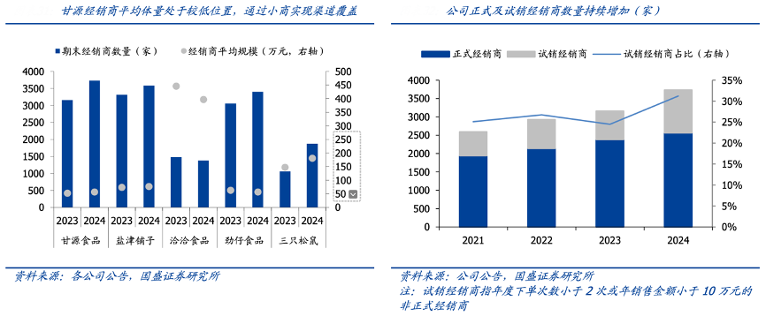 經典案例:根據各公司公告、國盛證券研究所等綜合資訊表明,甘源橫向對比看,甘源經銷商數量處于行業相對高位, 但經銷商平均體量處于較低水位,預計與甘源過去大單品集中度較高,以及渠道覆蓋度 寬幅密切相關。從渠道維度看,公司更加精耕運營,招募代言人提升品牌聲量,且持續招 募新經銷商,正式經銷商及試銷經銷商數量持續提升,側面印證市場覆蓋度逐步增加, 對潛力區域及空白市場的下沉更進一步。
