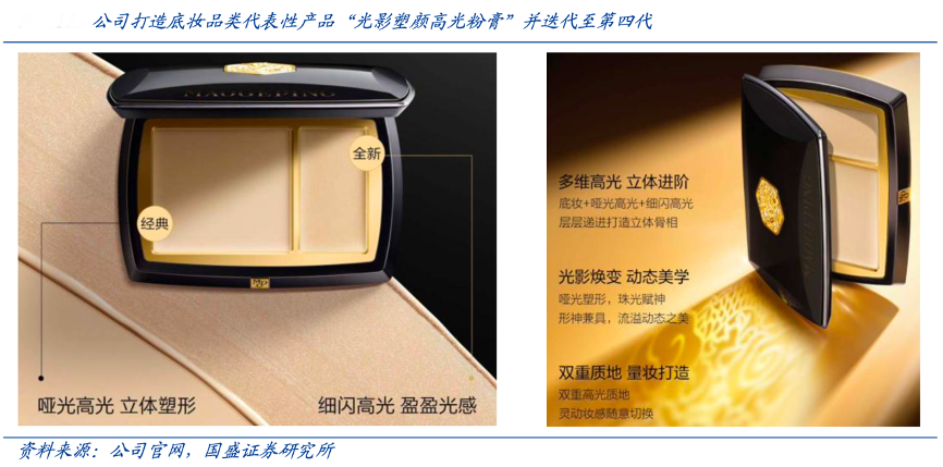經典案例:根據(jù)公司官網、國盛證券研究所等綜合資訊表明,毛戈平截至 2024 年 末,MGP 品牌的產品組合包含 400 多個單品,其彩妝產品系列包含 粉底、高光和陰影、眼妝、唇妝等品類,專為中國消費者獨特的膚質、面部結構和 審美偏好打造。其中代表性產品光影塑顏高光粉膏已上市逾十年,歷經廣泛的市場 測試,目前已迭代至第四代,可呈現(xiàn)自然亮白和立體五官。