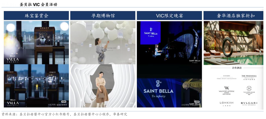 經典案例:根據圣貝拉母嬰中心官方小紅書帳號、圣貝拉母嬰中心小程序、華泰研究等綜合資訊表明,圣貝拉為留存客戶并激發客戶忠誠度,其為客戶提供獨家及限量版奢侈產品和服務,包括品牌聯名產品、聯合舉辦展覽活動、奢侈品和護膚品的私人銷售活動等。同時組織獨家會員私人活動,例如私人音 樂會、藝術活動及與名人的社交聚會。