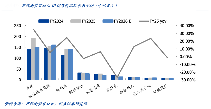 經典案例:根據萬代南夢宮官網、國盛證券研究所等綜合資訊表明,萬代 FY2025.3 中 期數據顯示,公司整體 IP 銷售由頭部三大 IP 主導,增長趨勢顯著,其中《龍珠》FY2025.3 集團銷售達 1906 億日元,同比增長 35.56%,體現 IP 在多業態并行下的強內容帶動力。