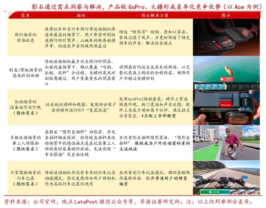 經典案例:根據公司官網、晚點LatePost微信公眾號等、華源證券研究所等綜合資訊表明,復盤影石產品發展歷程,公司創新的推出了一系列實用功能,滿足了全景/運動相機不同場景的細分需求。如 “隱形自拍桿”:為了防止自 拍桿破壞畫面,公司創新開發了自拍桿隱形算法,并很快成為行業主流。