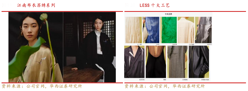經(jīng)典案例:根據(jù)公司官網(wǎng)、華西證券研究所等綜合資訊表明,江南布衣公司的產(chǎn)品設(shè)計(jì)不斷汲取傳統(tǒng)文化靈感,在設(shè)計(jì)上與東方美學(xué)相融合,JNBY 23 秋 冬融合國家非物質(zhì)文化遺產(chǎn)推出蘇繡系列,24 春夏系列融合空申苗寨女 性 傳 統(tǒng) 服飾,將當(dāng)代審美與中國傳統(tǒng)工藝相結(jié)合,彰顯獨(dú)特設(shè)計(jì)風(fēng)格。
