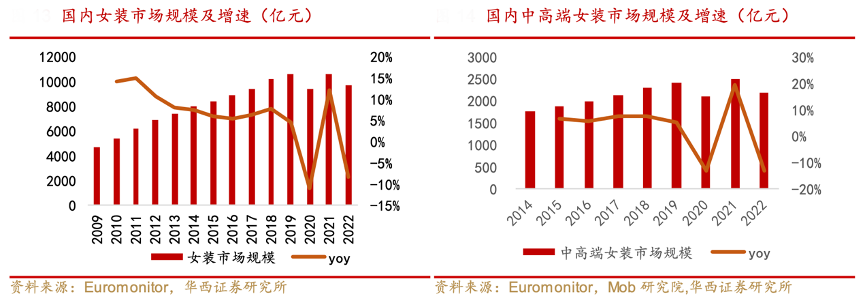 經(jīng)典案例:根據(jù) Euromonitor、Mob研究院、華西證券研究所等綜合資訊表明,中高端女裝市場(chǎng)占比從 2014 年的 22.2%持續(xù)提升至 2021 年的 23.7%,2022 年占比降至 22.3%,2014-2019 年中高端女裝市場(chǎng)增速 CAGR 為 6.5%,高于女裝市場(chǎng)。
