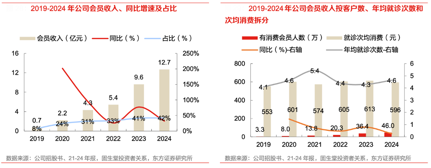 經(jīng)典案例:根據(jù)公司招股書、21-24年報、固生堂投資者關(guān)系、東方證券研究所等綜合資訊表明,固生堂以會員體系開拓高頻服務(wù)的增量客戶。公司于 2019 年 3 月推出會員制度,提供專有服務(wù)、貴細 藥材和咨詢費折扣價和綠色就診通道,會員數(shù)量和收入同步快速擴大。2019-2024 年會員收入和 有消費會員數(shù)量 CAGR 分別達到 76.8%和 69.8%。