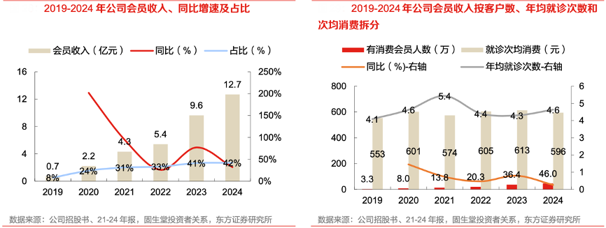 經典案例:根據公司招股書、21-24年報、固生堂投資者關系、東方證券研究所等綜合資訊表明,固生堂公司于 2019 年 3 月推出會員制度,提供專有服務、貴細 藥材和咨詢費折扣價和綠色就診通道,會員數量和收入同步快速擴大。2019-2024 年會員收入和 有消費會員數量 CAGR 分別達到 76.8%和 69.8%。