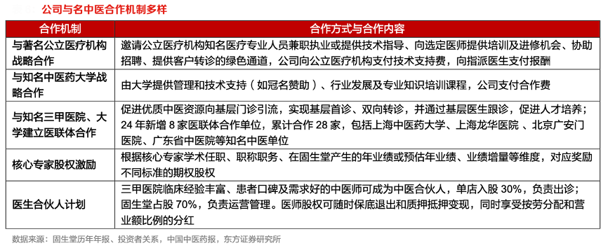 經典案例:根據固生堂歷年年報、投資者關系、中國中醫藥報、東方證券研究所等綜合資訊表明,固生堂通過與公立醫療機構戰略合作、醫聯體合作等吸引名中 醫多點執業,再結合醫生合伙人和股權激勵等措施深度綁定名中醫。截至 24 年底,其已擁有 8 名國醫大師、79 名全國名中醫,線下合作醫生 6052 人,其中資深中醫師占比達 47.0%,網絡合作醫生共計 40242 人,資深中醫師占比37.5%。