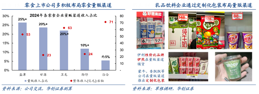 經(jīng)典案例:根據(jù)公司交流、草根調(diào)研、華創(chuàng)證券等綜合資訊表明,隨著零食量販逐步發(fā)展為下線市場(chǎng)的“食品便利店”,企業(yè)逐步順應(yīng)趨勢(shì)、陸續(xù)加碼,并通過協(xié)調(diào)定價(jià)、聯(lián)名、定制化包裝等降低對(duì)價(jià)盤的擾動(dòng),如蒙牛、香飄飄與零食很忙聯(lián)合生產(chǎn)“XXXL 型”產(chǎn)品,以及定制化生產(chǎn)小包裝產(chǎn)品在量販渠道鋪貨。