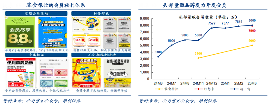 經(jīng)典案例:根據(jù)公司官方公眾號(hào)、華創(chuàng)證券等綜合資訊表明,2023 年左右零食很忙、好想來均開拓會(huì)員體系,配套以各類會(huì)員活動(dòng)及福利,開拓客群并強(qiáng) 化會(huì)員粘性,頭部企業(yè)會(huì)員數(shù)快速攀升,且鳴鳴很忙 1.2 億個(gè)、好想來 7900 萬個(gè)會(huì)員,大幅領(lǐng)先中小品牌不足 2000 萬會(huì)員的水平。