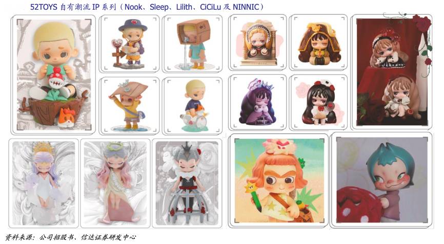 經典案例:根據公司招股書、信達證券研發中心等綜合資訊表明,52TOYS自有 IP:主要包括1潮流 IP,如 Nook、Sleep、Lilith、CiCiLu 及 NINNIC, 由公司進行打造,視覺效果獨特,個性鮮明。