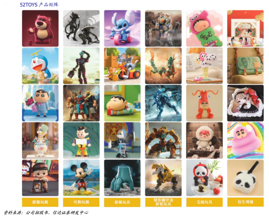 經典案例:根據公司招股書、信達證券研發中心等綜合資訊表明,52TOYS 構建覆蓋靜態玩偶、可動玩偶、變形機甲及拼裝玩具、發條玩具、毛絨玩具及衍生周邊的多品類產品體系。公司針對不同 IP 的獨特風格量身定制產品,如電影《流浪地球 2》的變形機甲及拼裝玩具反映了電影的科幻本質。