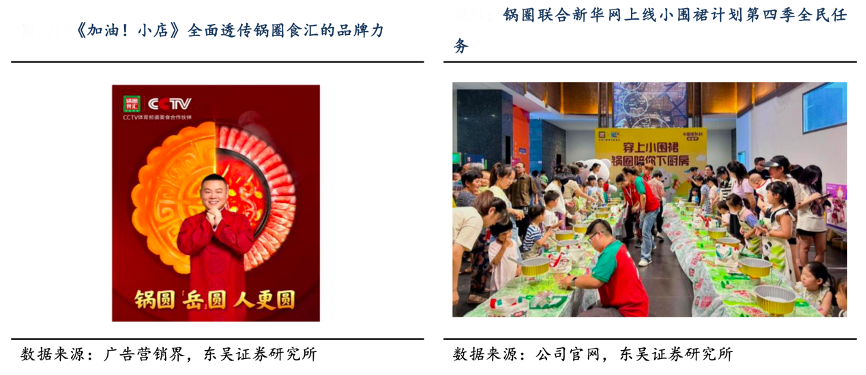 經典案例:根據廣告營銷界、公司官網、東吳證券研究所等綜合資訊表明,鍋圈公司通過代言人、官方渠道和綜藝節目植入廣告等持續深化品牌在消費者群體中的心智認知,2022年公司精準鎖定《加油!小店》和《暖暖的火鍋》兩檔衛視熱門綜藝,以此建立年輕大眾化溝通陣地;2024 年 7 月公司聯 合新華網上線暑期檔全民任務——小圍裙計劃第四季。
