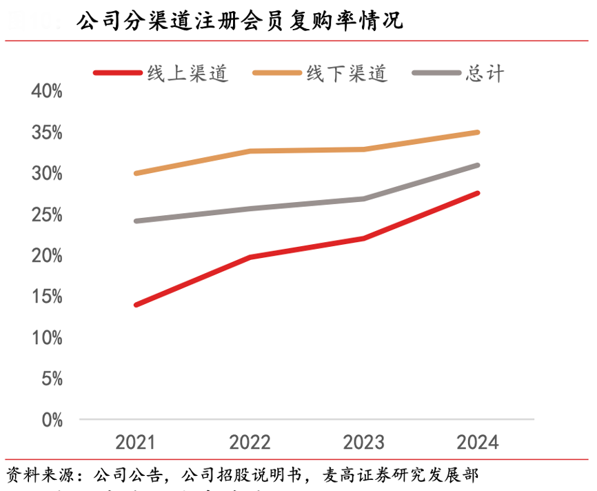 經(jīng)典案例:根據(jù)公司公告、公司招股說明書、麥高證券研究發(fā)展部等綜合資訊表明,毛戈平公司用戶忠誠度多年來持續(xù)提升,2024 年線下渠道和線上渠道會員復(fù)購率分別為 34.9%和 27.5%,線下渠道憑借體驗優(yōu)勢復(fù)購率較線上渠道高出 7.4pct。