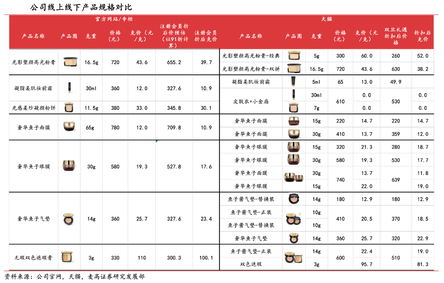 經典案例:根據公司官網、天貓、麥高證券研究發展部等綜合資訊表明,毛戈平目前公司線上收入仍在快速提升狀態,蓄水池較大。其線下專柜渠道和線上渠道消費群體畫像存在較大交叉可以有效豐富客群畫像,擴大會員池。